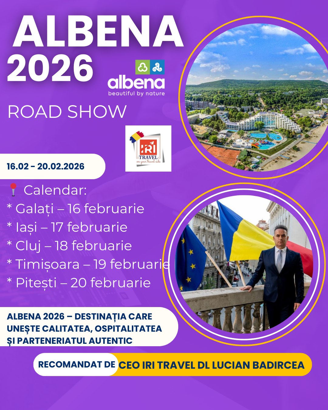 Prin această caravană națională, IRI Travel și Albena reconfirmă angajamentul față de piața din România și față de comunitatea de agenți care contribuie, zi de zi, la succesul vacanțelor pe litoralul bulgăresc.